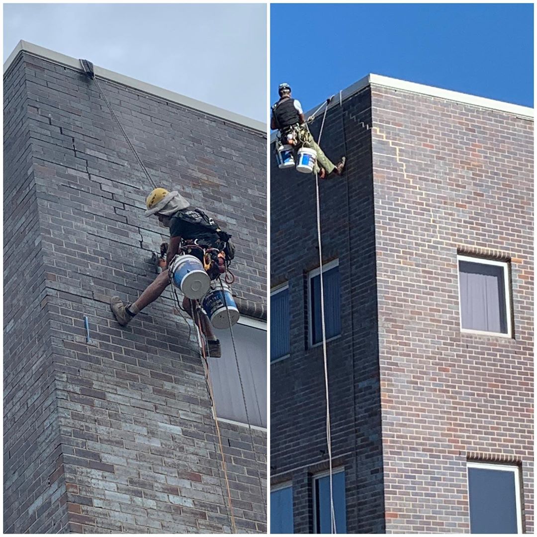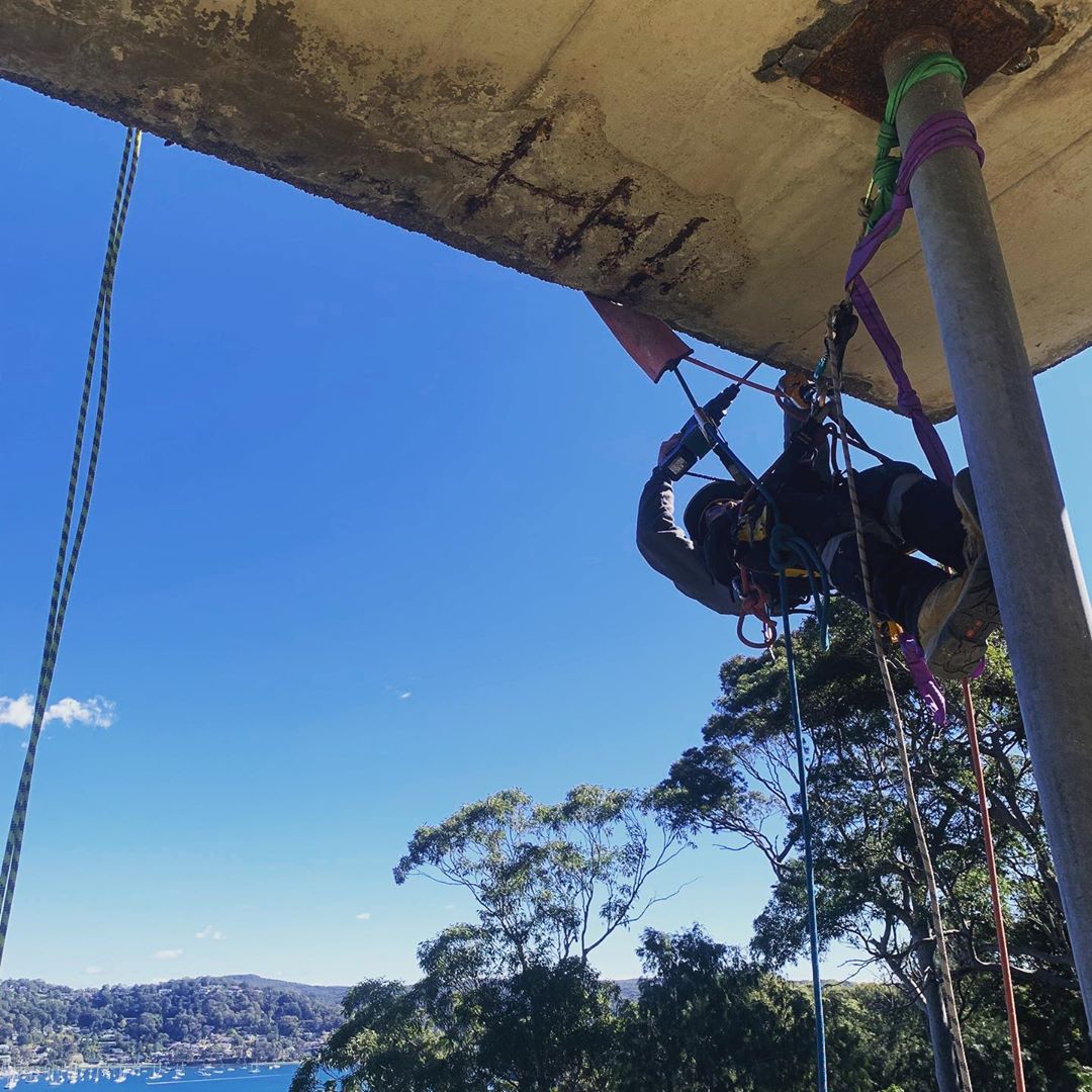 Boys hard at it today, render repairs, waterproofing and then fresh coat of paint. #petzlprofessional #petzl #ropeaccess #ropetech
